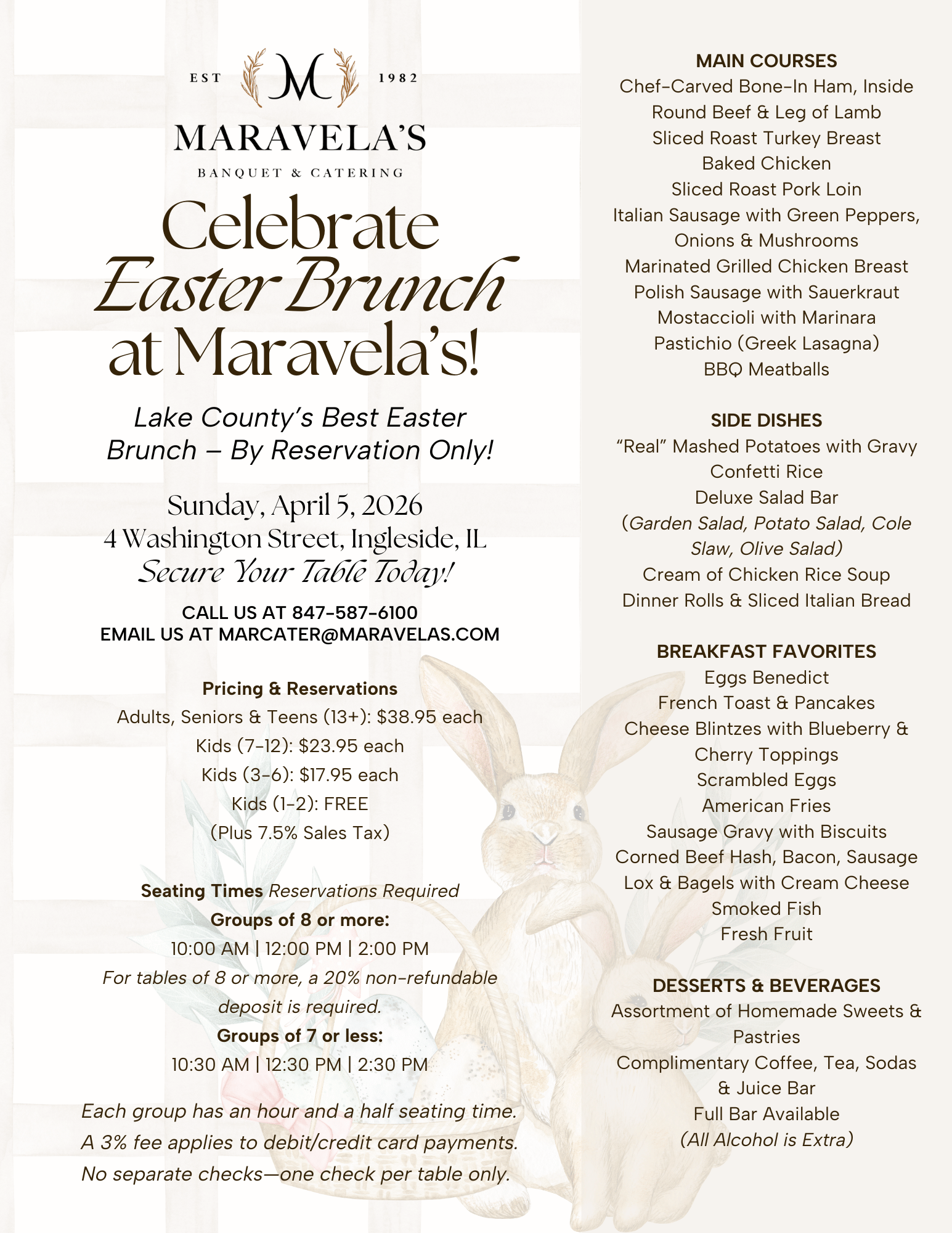 Gather your loved ones and join us for Lake County’s most celebrated Easter tradition! Maravela’s Easter Brunch is back on Sunday, April 5, 2026, featuring an elegant all-you-can-eat buffet filled with classic favorites, gourmet entrées, and irresistible desserts. With beautifully decorated tables, fresh spring florals, and warm hospitality, Easter at Maravela’s is an experience your family will remember for years to come.